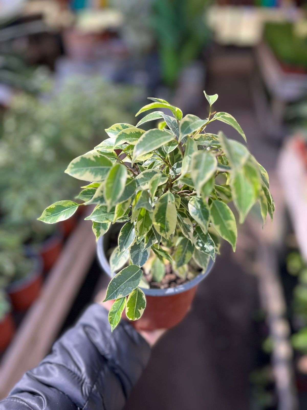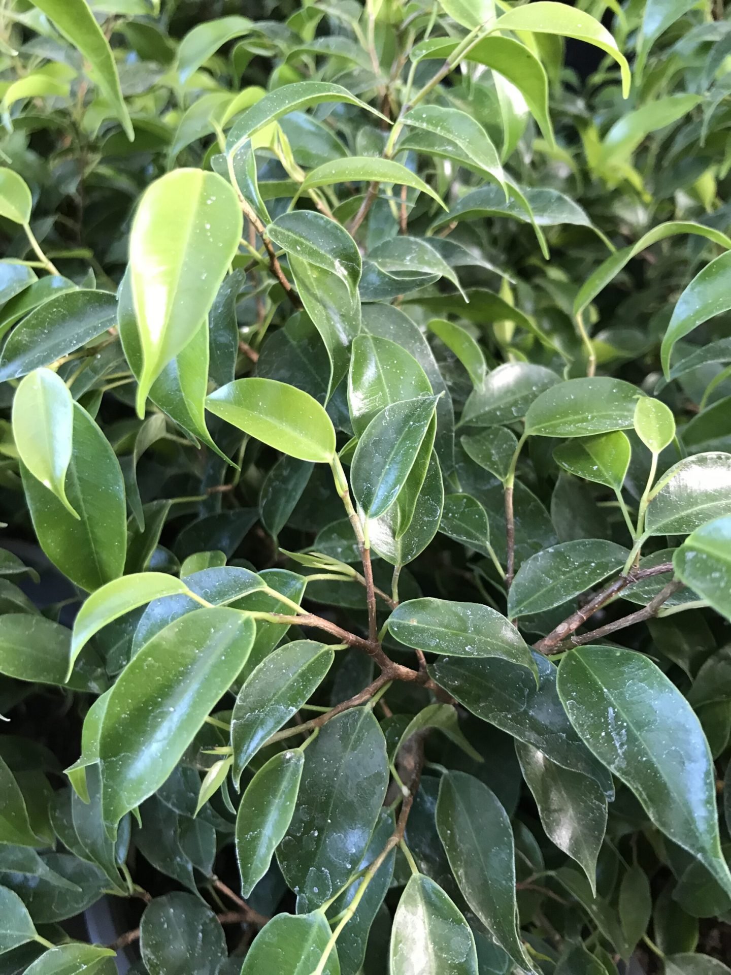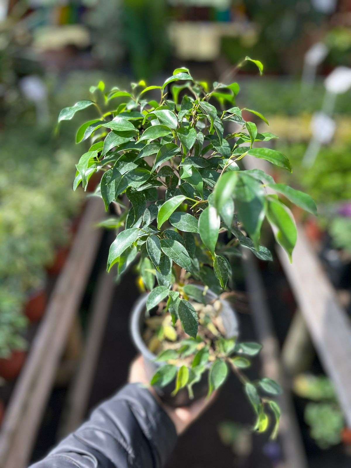 Ficus tradicional enano, con abundante follaje verde. Es una planta de hojas perennes, esto puede deberse a los cambios de temperaturas que sometamos nuestra plantita o falta de vitamina (nitrógeno).