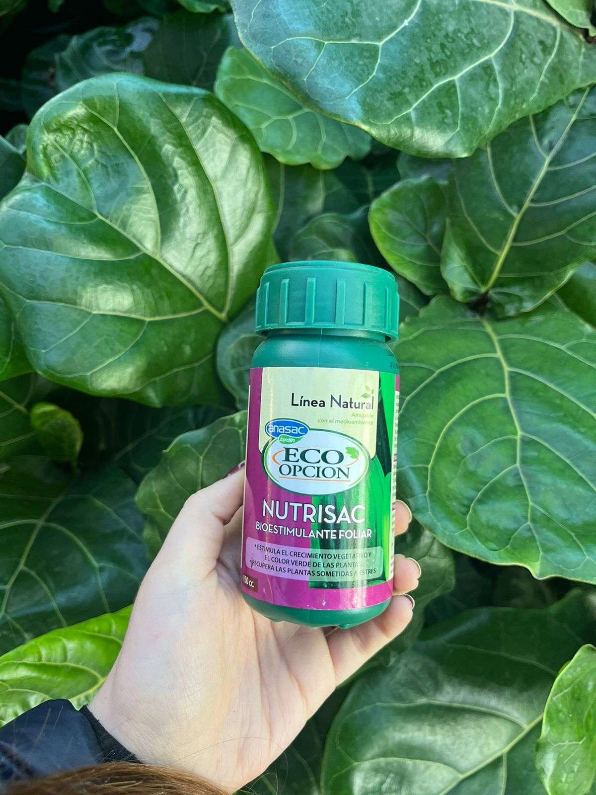 - Nutrisac Eco Opción® es un Bioestimulante líquido de origen natural. Este producto fue elaborado especialmente, para el desarrollo y crecimiento de las plantas. Gracias a su formulación es absorbido rápidamente y asimilado por las plantas, por lo que permite recuperarlas de situaciones de stress (trasplante, daño por frío, falta de agua, enfermedades y otros.)